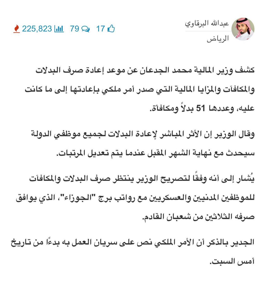 هاشتاق السعودية On Twitter الجدعان صرف البدلات والمكافآت للموظفين المدنيين والعسكريين مع رواتب الجوزاء الموافق 30 شعبان سبق أوامر ملكية Https T Co Tbnls0fa4i